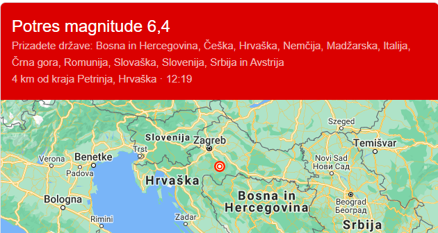 Prizadete države: Bosna in Hercegovina, Češka, Hrvaška, Nemčija, Madžarska, Italija, Črna gora, Romunija, Slovaška, Slovenija, Srbija in Avstrija4 km od kraja Petrinja, Hrvaška · 12:19