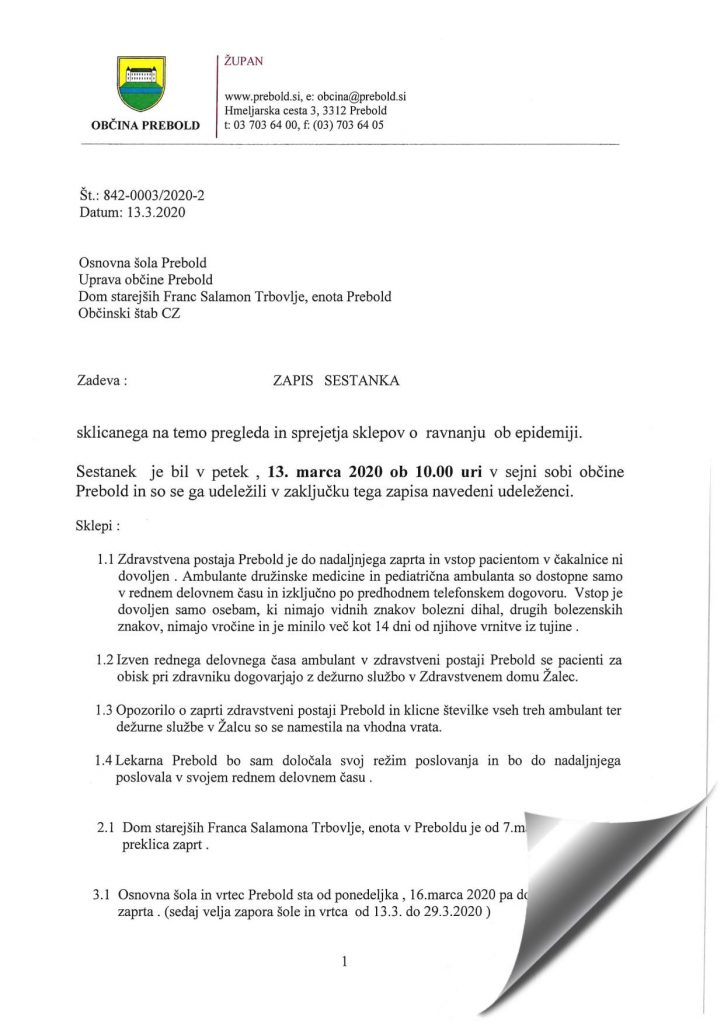 v sporočilu si lahko ogledate zapisnik sestanka, ki ga je sklical župan Vinko Debelak danes na sedežu Občine Prebold, glede ravnanja ob epidemiji.