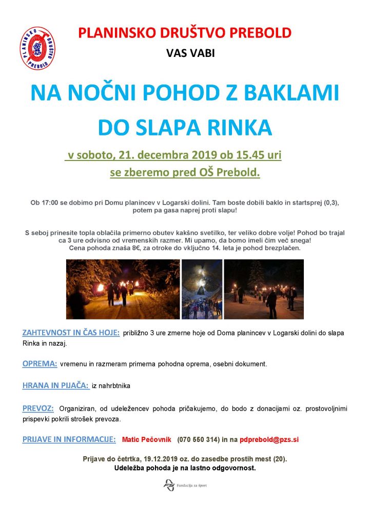 Planinsko društvo Prebold, Vas vabi na nočni pohod z baklami, do slapa Rinka