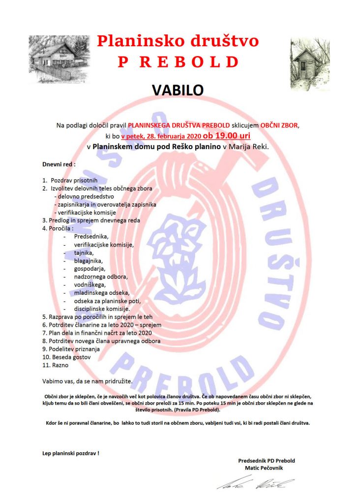 PLANINSKO DRUŠTVO PREBOLD sklicuje OBČNI ZBOR, ki bo v petek, 28. februarja 2020 ob 19.00 uri v Planinskem domu pod Reško planino v Marija Reki.