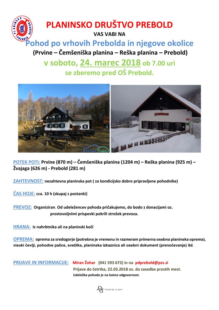 Planinsko društvo PREBOLD VAS VABI v soboto, 24.03.2018 na Pohod po vrhovih Prebolda in njegovi okolici, več info. je v prilogi.