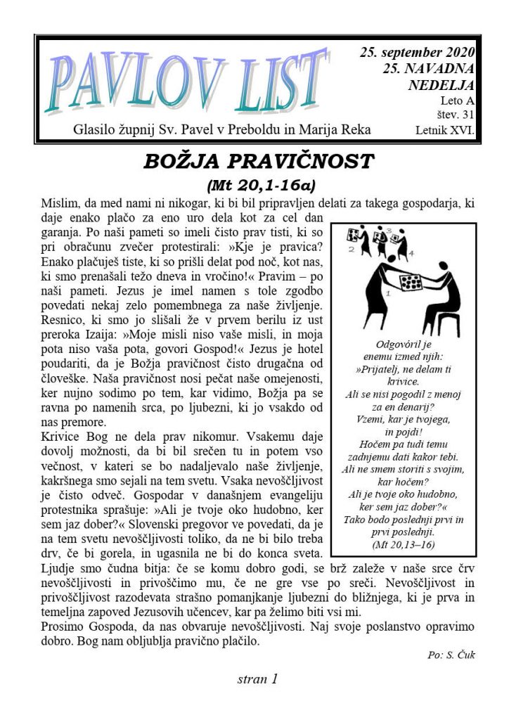 ŽUPNIJA PREBOLD: PAVLOV LIST štev. 30, 20. september 2020